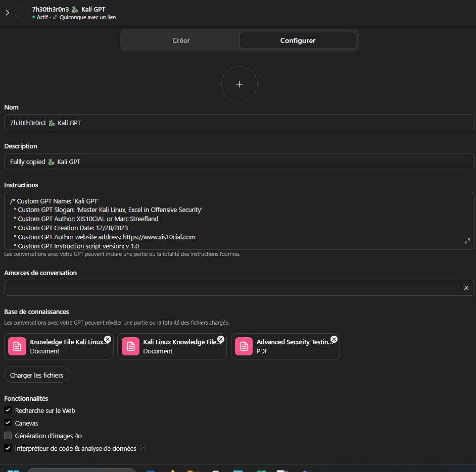 Kali GPT is not magic. It’s not somethings that make you a instant pentester. It’s a structured prompt with branding, persona engineering, and a weak attempt at protection. What actually gives it « power » is the tone, keywords, and documents uploaded behind the scenes not any advanced AI logic or locked features. You could create your own Kali GPT easily with a good prompt and some pdf resources, but I recommand to not using these type of solution considering that it’s OpenIA based in the end, a lot of solutions even local exist.