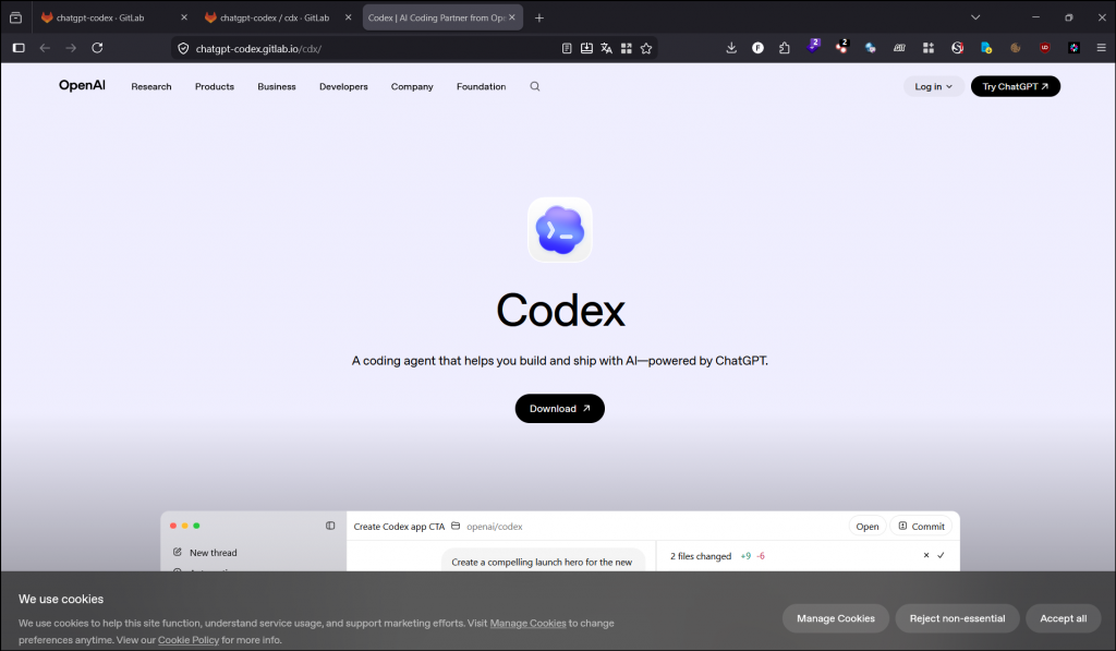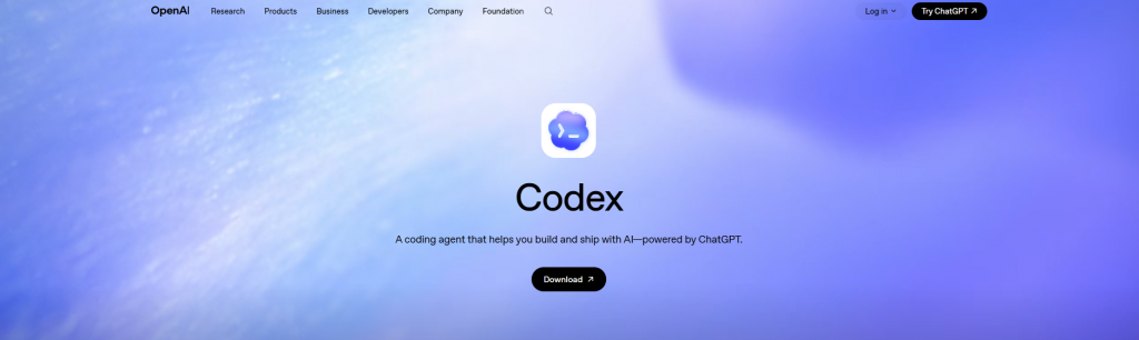 A pixel-perfect clone of the real OpenAI Codex page. The logo, the gradient background, the navigation bar (Research, Products, Business, Developers, Company, Foundation), the « Try ChatGPT » button in the top right, the « Log in » link. Everything. If you put this next to the real openai.com/codex, you’d have trouble telling them apart.