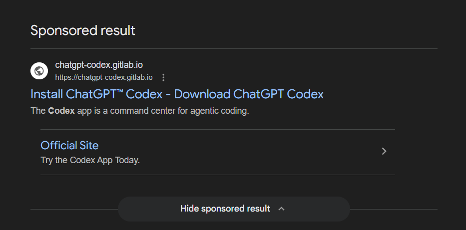 - Don’t trust Google Ads for downloads. Attackers buy ads for popular tools all the time. Always navigate to the official website manually. For Codex, that’s